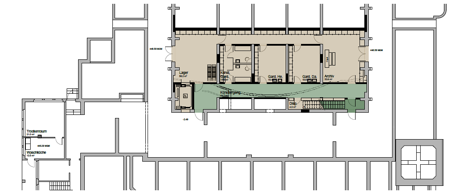 - Die bisherigen Nasszellen werden zu einem Office umgearbeitet, welches fortan als Drehscheibe für die gastronomische Versorgung dient.